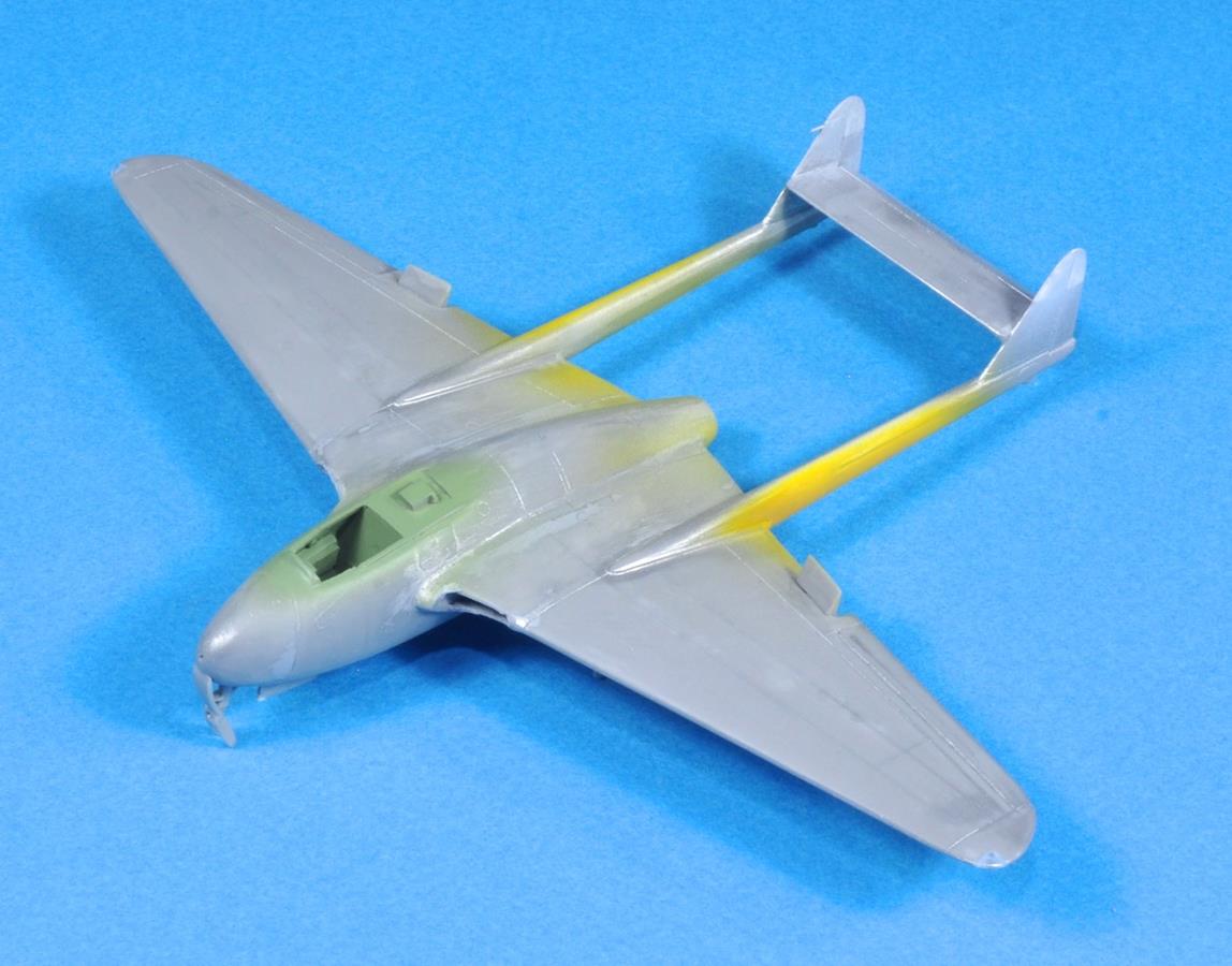 De Havilland DH-100 Spider Crab - Royaume-Uni 1943- Amodel + Scratch Prototype du Vampire, le DH-100 Spider Crab va réalisé son premier vol le 20 septembre 1943. Les formes générales du Vampire sont déjà là, mise à part des dérives trop grandes qui seront rapidement raccourcies. Une conversion à partir du Vampire Mk-I d'Amodel, sans grandes difficultés, il s'agit surtout de faire disparaitre les détails des avions de série. La décoration est réalisé à la découpeuse Silhouette.