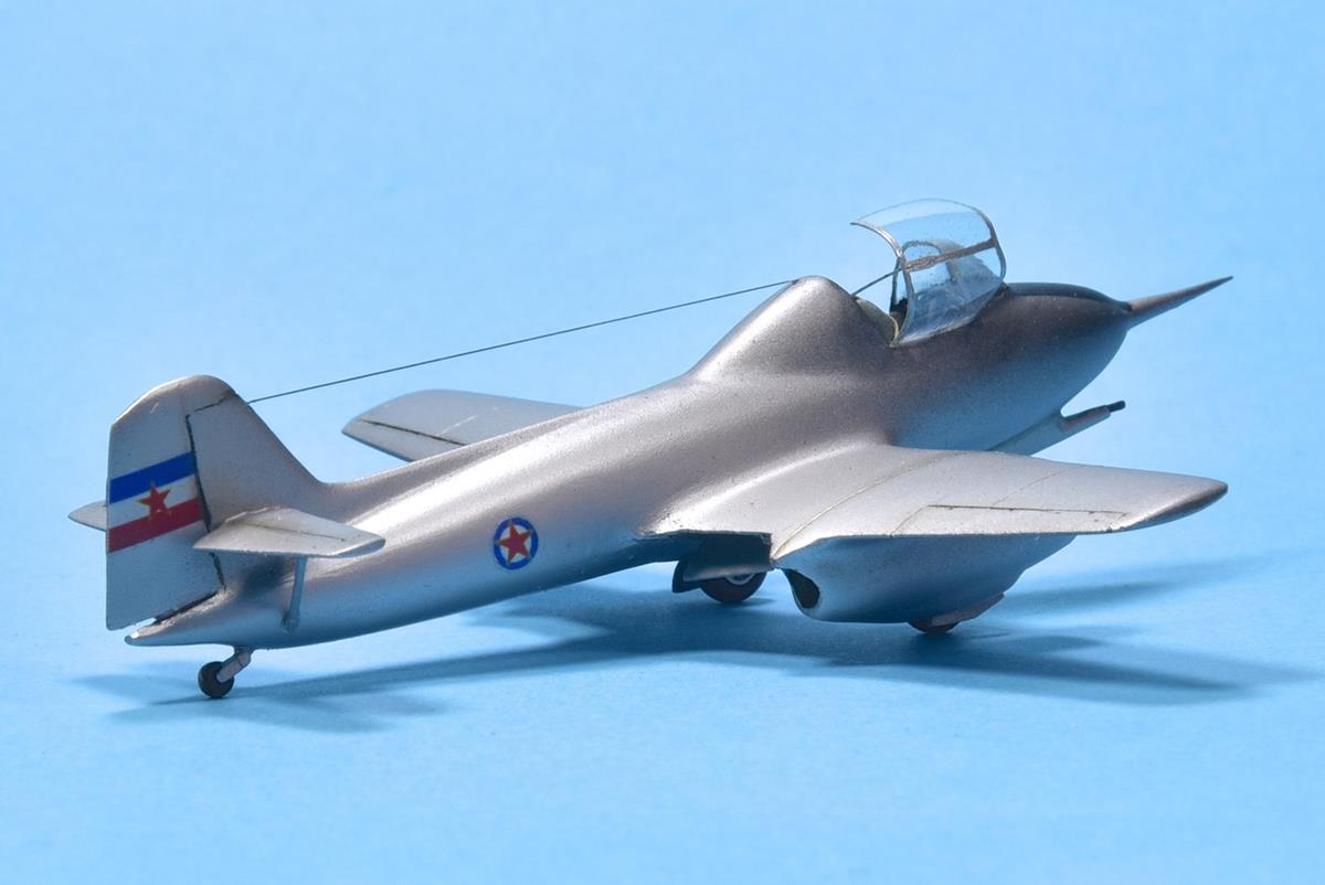 IKARUS S-451M Mlazni - Yougoslavie 1952 - Résine Aeropoxy Le S-451M fait parti d'un groupe d'avions expérimentaux yougoslave construits au début des années 50. 2quipé de deux réacteurs Turboméca Palas 056A, il fut le premier jet de ce pays le 25 octobre 1952 piloté par le capitaine Prebeg. Il portait sous son fuselage un faux canon HS-404 de 20mm afin de tester une future version de chasse. Une résine Aeropoxy catastrophique, elle a la consistance d'une mousse d'étanchéité, sous une fine surface lisse elle à l'apparence d'une éponge. Je n'ai pu réalisé qu'un travail bâclé sans aucune motivation mise à part celle de compléter ma série de premier jets.