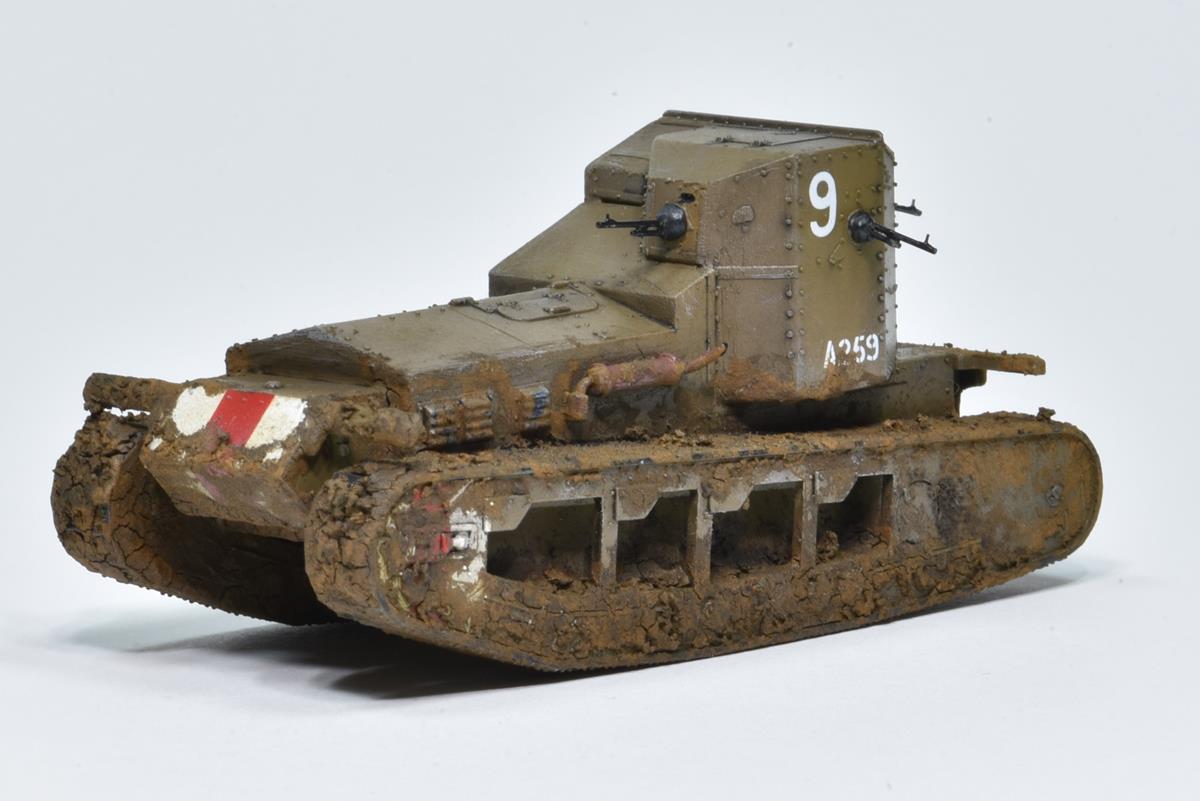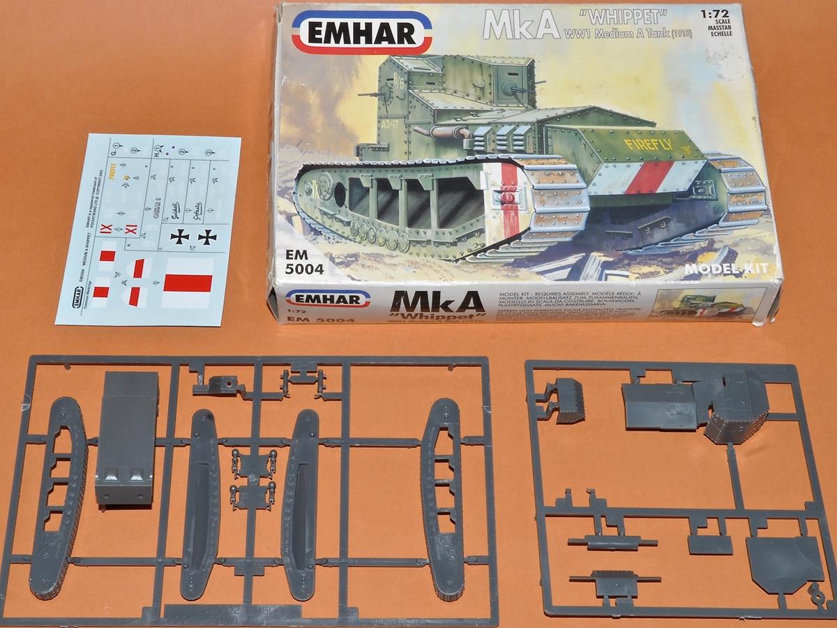 Mark A Whippet - Royaume-Uni 1917 - Maquette EMHAR Char moyen britannique, le Whippet (Lévrier) était l'évolution ultime du premier char Little Willie. La formule est simple, un tracteur équipé d'une cabine blindée et de quatre mitrailleuses Hotchkiss. Il fut construit à 200 exemplaires. Une maquette simple et facile à monter, les mitrailleuses trop épaisses sont à remplacer.