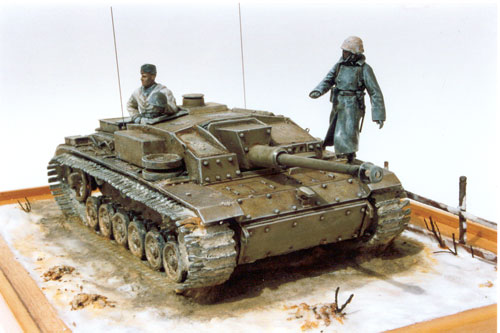 Nella primavera del 1942, entrò in servizio il primo Stug III con cannone a canna lunga, in grado di affrontare anche a grandi distanze i carri sovietici. Ben presto, fu disponibile l’ancora più potente 75/48 e si provvide a montarlo senza troppe modifiche sulla sovrastruttura dello Ausf. F, ormai collaudato e comunque più protetto della media dei Panzer e Panzerjagers allora in servizio. Fu necessario migliorare lo scafo, con la versione J ne era stato introdotto uno perfezionato che aveva le piastre laterali estese in avanti con occhini di traino incorporati. La parte posteriore era più lunga di 14 cm, con presa d’aria inferiore ingrandita, la ventilazione del vano motore era migliorata anche grazie al cofano motore ridisegnato, con nuovi portelloni e prese d’aria ingrandite e meglio protette. La sovrastruttura presentava le piastre anteriori inclinate diversamente dai tipi precedenti, con spazi interni più sfruttabili per caricarvi granate, aumentando così la dotazione standard. La postazione del cannocchiale per il cannone era leggermente modificata. La produzione cominciò nel settembre 1942 alla Alkett, senza soluzione di continuità rispetto alla versione precedente; quasi subito, già in catena di montaggio, si applicarono corazze aggiuntive da 30 mm sulle piastre frontali dello scafo e della sovrastruttura. Non fu una versione molto significativa, con soli 205 esemplari completati sino al dicembre dello stesso anno, ma costituisce la premessa al molto famoso Ausf. G. Una parte della produzione, dal novembre, fu realizzata su scafi ‘riciclati’ di Panzer III Ausf. L, riconoscibili a prima vista per i portelli di prua singoli e senza cerniere. Il crescere di numero delle brigate di cannoni d’assalto costituite ne incamerò un buon numero ed il nuovo Stug III fu usato prevalentemente sul fronte orientale, con più che buoni risultati anche se non poteva sostituire in tutto i panzer, almeno in campo aperto. Le battaglie d’attrito del 1943 consumarono velocemente i non molti F/8, che nella prima parte dell’anno successivo furono in servizio anche in Italia e Francia. Il kit in scala 1/35 Finalmente, da qualche tempo, esiste un modello anche di questa meno conosciuta versione “ canna lunga”, prodotto dalla Revell, il kit si presenta come un miglioramento di quello Dragon, ne sfrutta le stampate e presenta corazze supplementari, nonché un set di cingoli maglia per maglia. Un buon terzo dei pezzi si rivela in più ed è una vera manna per la nostra riserva, però attenzione, occorre avere un’idea precisa, le istruzioni non ci aiutano molto in tal senso. E’ consigliabile controllare bene prima di eliminarne qualcuno, per evitare possibili contrattempi. Comunque, il kit si presenta con dimensioni precise ed una buona resa dei particolari, in genere i dettagli sono nitidi e non c’è quasi nessuna necessità di ricorrere allo stucco. L’unione dei pezzi è più precisa per quelli che compongono lo scafo, la plastica è un po’ morbida e la colla normale tende a scioglierla un po’ troppo, in più le parti più lunghe potrebbero svergolarsi. Un’incongruenza è la ricomparsa di un sistema di posizionamento degli attrezzi obsoleto, sui parafanghi sono presenti le loro sagome in rilievo, il che ci darà del lavoro in più per eliminarli cercando di non rovinare il bel dettaglio dei parafanghi. Pur non toccando le vette dello Stug III Ausf. G Tamiya, il kit resta una buona replica, con poche correzioni di rilievo. La documentazione ora non manca, ed in genere essa tratta pure le versioni precedenti e successive, restando sempre un buon investimento. Attenzione : due esemplari presentati, quelli numerati 178 e 191, erano in realtà degli Ausf. F. Chi può affrontare la spesa, potrà facilmente completare il kit scegliendo quello che più gli confà nella miriade di accessori dedicati al Panzer III e derivati, la cui lista porterebbe via un bel po’ di spazio. Realizzazione del modello Entriamo ora nel vivo, scegliendo la versione con le piastre addizionali imbullonate su scafo e sovrastruttura. Lo scafo presenta ben poche correzioni da farsi nel treno di rotolamento e del resto, come vedremo, avendo scelto un esemplare invernale, ruote e cingoli saranno abbastanza coperti dalla neve, fango ecc.. Dallo scafo (Tav. 1 – Particolare 1) eliminiamo la piastra anteriore da 30 mm e sostituiamola con del plasticard che simuli i 50 mm della piastra di base. Eliminare anche la piastra orizzontale (2) coi due portelli unici, peculiare degli scafi Ausf. L, sostituendola con l’analoga parte a portelli doppi di un Panzer III. Con un buon seghetto, facendo attenzione a non tranciare od indebolire eccessivamente le parti, il lavoro risulterà accurato ed avremo delle ottime giunzioni con il minimo di stuccature. Per tenere la piastra a filo dei parafanghi e di quella inclinata, incolleremo inferiormente dei pezzi di sprue o plasticard. Quando monteremo la sovrastruttura sostituiremo il pezzo E 30 con una striscia paraschegge, ed il pezzo I 35 va aggiunto per ultimo. Passando alla parte posteriore dello scafo, la zona è da rendere più realistica, riproducendo le saldature fra le piastre lungo i bordi (3), c’è inoltre da recuperare un elemento quadrangolare da un kit di Panzer III, per sostituirlo al pezzo F 33 (4). Sulla piastra inclinata posteriore (5) aggiungeremo i bulloni che trattenevano centralmente il contenitore interno dei fumogeni. Le piastre deflettrici (pezzi F38/40 e 51/52) non le abbiamo montate, sono troppo spesse e comunque sostituibili con qualche elemento fotoinciso. La parte anteriore della sovrastruttura (6) va più o meno montata come da istruzioni, tranne che per il dover diminuire lo spessore delle parti E26/27, piazzare una una striscia ad hoc (A) sotto, diminuire lo spessore delle parti prima d’incollarle (B), riquadrare meglio la parte centrale rimovibile della piastra dietro al conducente (C) ed allargare un po’ l’apertura della ferito