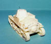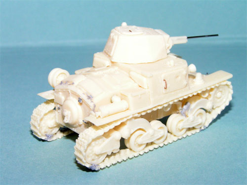 Si tratta di un prodotto artigianale in resina, di buona qualità, lavorabile e con pochissima bolle d’aria, in un sobrio color sabbia. Molto buona l’idea di aver realizzato pezzi premontati, per non farne un kit riservato solo ai più esperti, visto che la resina nelle scale piccole per certuni è ancora un tabù. Infatti il kit è composto da pochi pezzi, come lo scafo principale, completo di parafanghi e con già inserita la piastra inclinata anteriore, treno di rotolamento preparato già per sottoinsiemi, attrezzi , cingolatura preparata in sezioni già piegate e curvate nel caso delle ruote motrici e di rinvio, torretta già predisposta con portello superiore a parte. Lo stampo è molto accurato vista la scala, che denota un amore per i dettagli non comune; con martinetto di sollevamento, fari, piccone e maglie di cingolo di scorta forniti a parte. Le dimensioni in generale quadrano e diversi minuti particolari si apprezzano con una lente di ingrandimento, complimenti !