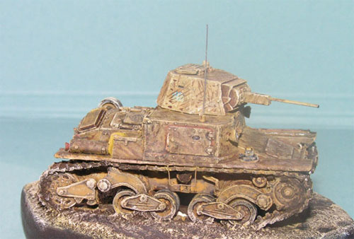 Ma ora procediamo all’invecchiamento, prima con un lavaggio molto delicato di Nero e Bruno Van Dyke ad olio, diluito con acquaragia sintetica – quella per smacchiare – al 90 %. I cingoli vanno dipinti con una miscela di metallo e marrone - a smalto – i rulli del treno di rotolamento con un panzergrau non troppo scuro. Se la patina fosse ancora troppo poca, dopo qualche giorno si può applicare un secondo lavaggio sul genere del primo, magari dove il fango era stato applicato di più, vedrete comunque che un lavaggio sarà sufficiente per non trasformare il modello in un “blob” semovente. Per avere un’idea di come stendere il fango in scala, un piccolo trucchetto è reperire la tavola centrale della vecchissima opera ‘Storia dei mezzi Corazzati’ della Fabbri e ridurla nella giusta scala, con qualche verifica alle fotografie disponibili, un pennello 000 e mano ferma, il tutto dovrebbe venire pure bene, a patto di fare le cose con calma. Se ci accorgessimo di aver steso delle pennellate troppo grandi potremo con un pennellino 000 intinto nell’acquaragia ridurne le dimensioni, ottenendo contemporaneamente un effetto più realistico.