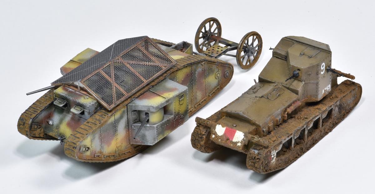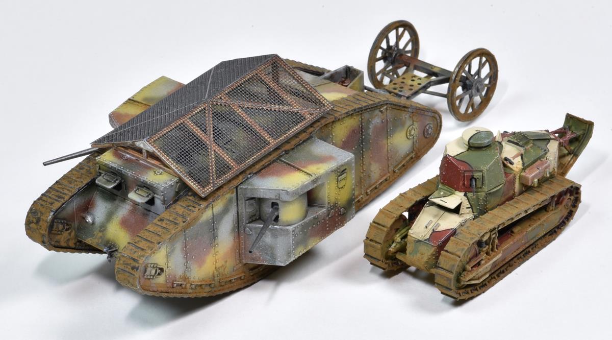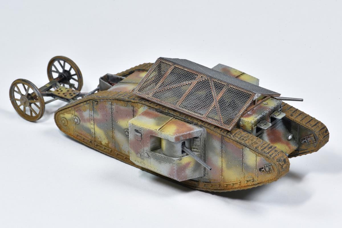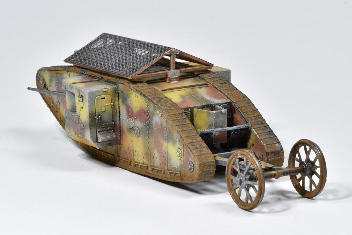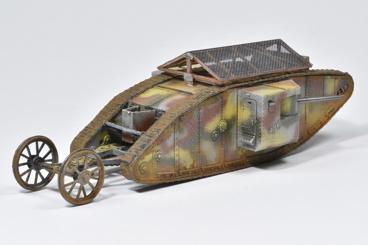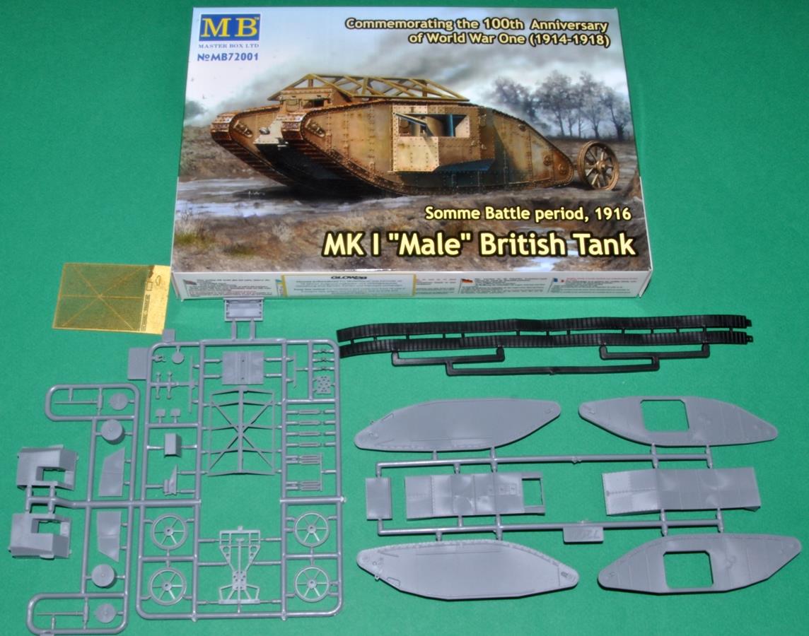 MARK I MÂLE - ROYAUME-UNI 1916 - Maquette MB Après les prototypes "Little Willie" et "Mother", il sera le premier char utilisé au combat pendant la bataille de la Somme en septembre 1916. Le kit est fin et bien conçu mis à part le jeu de chenilles en caoutchouc qu'il faut étirer comme un chewing-gum pour que les deux extrémités se touche, étirage qui va déformer ces chenilles.