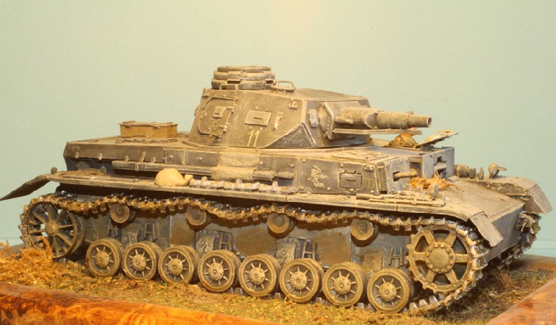 Per finire, qualsiasi tipo di danno sufficiente a fermare un carro voleva dire l’abbandono da parte dell’equipaggio, o dei suoi superstiti, perciò la possibilità che si veda qualcosa degli interni della torretta, del vano motore o della camera di combattimento. Per il resto, non si dovrebbe vedere molto delle viscere di un carro danneggiato, a meno che i danni non siano catastrofici. Danni gravi però vogliono dire segni d’incendio a bordo, il che nasconderebbe in gran parte i possibili dettagli e toglierebbe di mezzo i carichi esterni ed il treno di rotolamento, le cui parti in gomma di rulli e ruotini venivano ridotti a semplici pezzi calcinati, con una pila di cenere attorno.