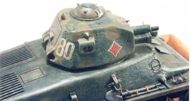 In genere, non c’è necessità di applicare tinte di fondo per i modelli in plastica “da scatola” a meno che, per esempio, non si debba dipingere con un colore chiaro un modello in plastica scura. Un buon primer dovrebbe aderire bene ed evidenziare le imperfezioni superficiali. Per avere i migliori risultati, può essere necessario stenderlo con l’aiuto di una aerografo; per la sua asciugatura, sono sufficienti poche ore, ma se da un’ispezione si trovassero ancora depressioni o segni di giuntura bisognerà ripetere di nuovi i passaggi di stuccatura e carteggiatura per tornare poi ad un nuovo primer. Al di là del colore di base o mimetizzato, gli ultimi dettagli resteranno sempre quelli degli attrezzi ed altri caricamenti di bordo, l’armamento leggero o più semplicemente elementi o parti da trattare separatamente. Molti, quasi tutti, i carri del periodo avevano anelli gommati attorno ai rulli principali e reggicingolo. Per evitare di tribolare, monteremo di volta in volta un rullo su di un supporto, da tenere in mano ed in modo da poter agevolmente usare il pennello ed una tinta grigio-scuro, il nero non è mai troppo realistico; ovviamente usando l’aerografo c’è da mascherare la parte centrale, anche se fossimo molto esperti. I cingoli sono una parte che rimane in genere ‘al naturale’ e per di più ben presto soggetta a polvere, ruggine, sporco e quant’altro. Il tutto può nascondere molto delle originali maglie metalliche, una tonalità adatta come partenza può essere un grigio metallico se il mezzo è di recente produzione, od un marrone rossastro, chiaro o scuro, se operativo da qualche tempo, a carro fermo un velo di ruggine è sempre presente. Alcune cingolature hanno delle tacche in gomma al centro e così le parti visibili di cingolo restano quelle laterali, i denti di guida e le connessioni tra le maglie. Gli interni erano solitamente dipinti in colori adatti a renderne un po’ più luminosi e vivibili gli angusti spazi nei quali operavano gli equipaggi, come il bianco opaco – bianco avorio od il grigio chiaro. Gli interni dei portelli invece erano nello stesso colore di fondo del mezzo, perché colori chiari sarebbero stati troppo visibili. Nel caso di interni di mezzi a cielo aperto, la verniciatura si esegue con tecniche prese da quelle che si adottano per i figurini. Anche qui, non è importante la fedeltà assoluta nei colori ma la sensazione di realismo trasmessa. Su di una base di colore si farà uso del dry-brushing con colori chiari, smalti oppure oli, per i particolari sporgenti o di un piccolo “bagno di colore” ad olio scuro per evidenziare ombre ed incisioni. Le mitragliatrici vanno in metallo brunito, riproducibile realisticamente dipingendole in nero, poi con un pennello secco ripassandone canna e meccanismi col metallo brunito o con della grafite. Le loro installazioni e/o supporti facevano parte in permanenza dei mezzi e vanno dipinte nel colore di fondo, contenitori delle cartucce compresi. Le granate di bordo sono spesso presenti nei kits o come parti aggiuntive, ognuna aveva una sua precisa forma e colorazione, perciò anche qui ci si deve documentare bene. Se ancora restassero incertezze, nero opaco, grigio scuro o verde sono stati colori molto usati, così non ci sono pericoli di sbagliare troppo. La virtù principale che serve per la verniciatura è la pazienza, è meglio non tentare di fare nulla di corsa, cercando magari di dare una seconda mano sopra la prima senza averle prima dato la possibilità di asciugarsi molto bene. A meno che non si debba dipingere un colore scuro su plastica scura, quasi certamente avremo bisogno di due strati per ottenere un risultato perfetto, pena l’insuccesso. Quando bisogna verniciare colori chiari su plastica scura, è meglio applicare prima una mano di fondo grigio opaco.